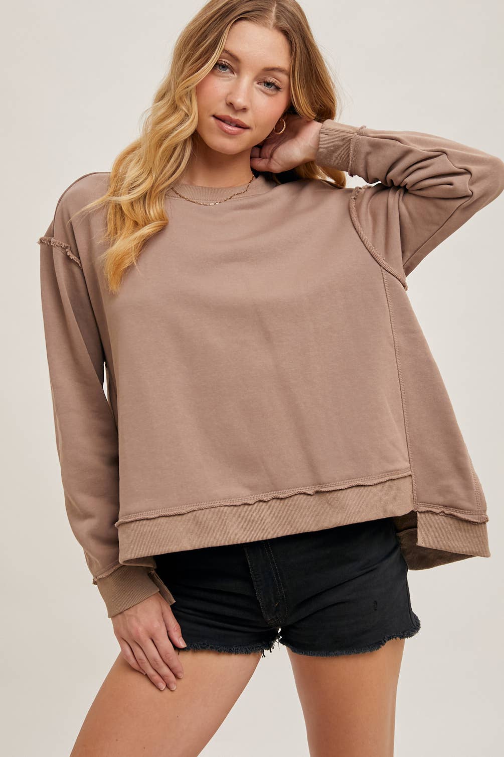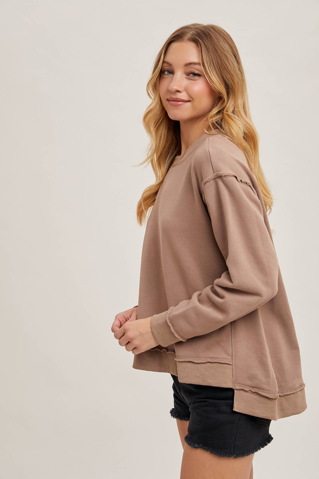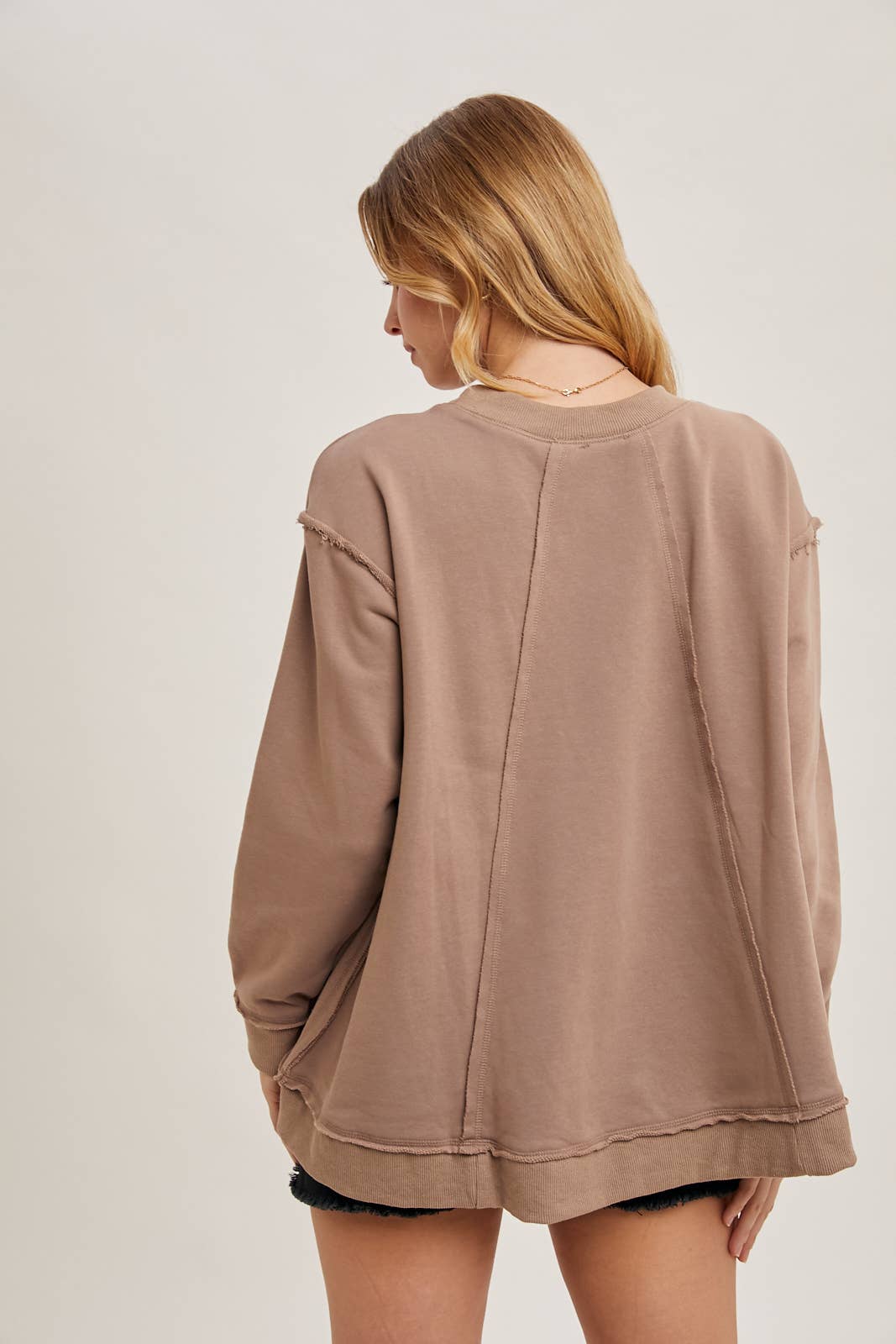 French terry pullover featuring a crewneck, dropped shoulder, raw edge detail, vented ribbed hem, oversized flowy silhouette.