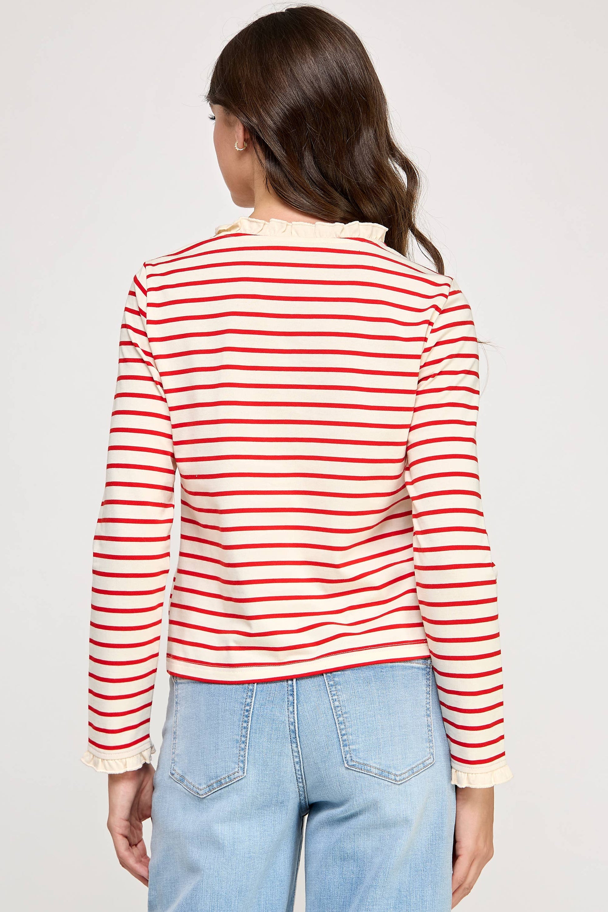 TT-10481-6 RUFFLE DETAIL STRIPED HENLEY TOP-CREAM RED